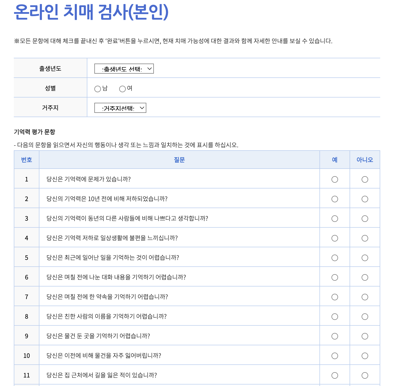 📝 치매 자가진단 테스트 예시 (서울시 공식 기준)
