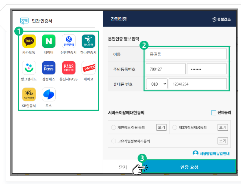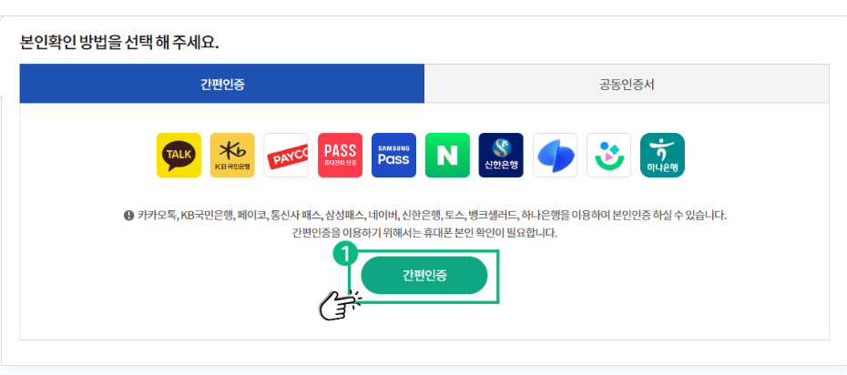 - 회원가입 후 공동인증서(구 공인인증서) 또는 간편인증(카카오, 네이버, 패스 등)으로 로그인합니다.