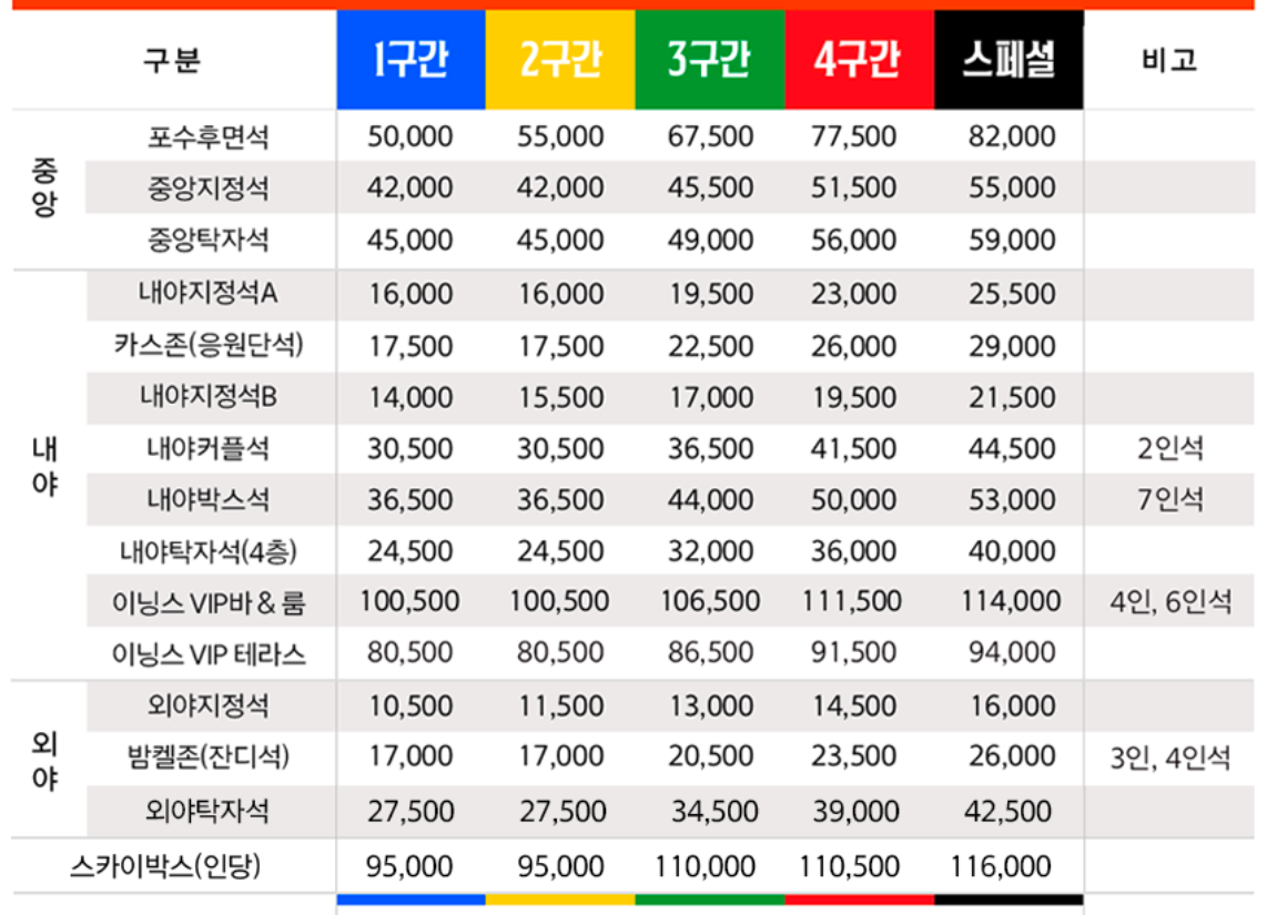 - 할인: 어린이(60%), 청소년/경로/장애인(50%), 키즈클럽 회원(외야 무료) 등