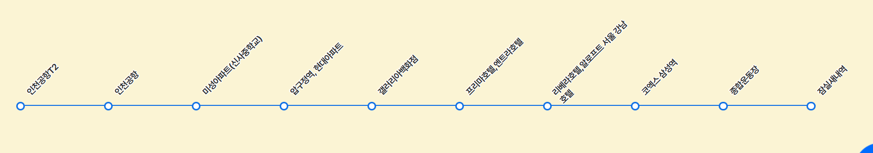 잠실새내역 → 잠실종합운동장 → 코엑스 삼성역 → 리베라호텔(알로프트호텔) → 프리마호텔(엔트라호텔) → 갤러리아백화점(압구정로데오역) → 압구정역(현대아파트) → 신사중학교 → 인천공항 1터미널 → 인천공항 2터미널