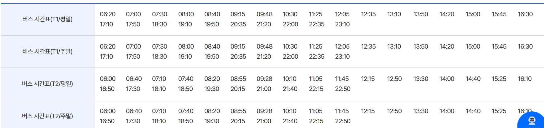 - 제2터미널: 첫차 06:00 / 막차 22:50